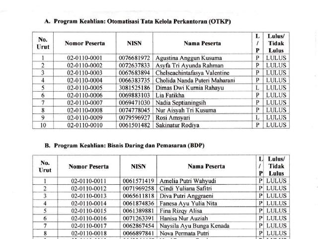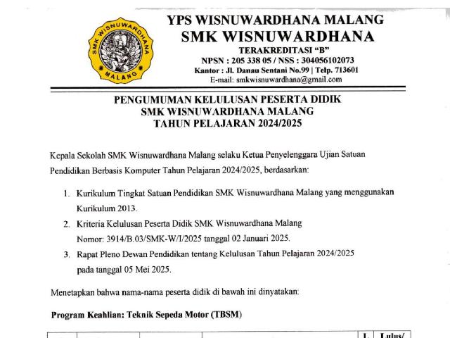 LEMBAR PERTAMA PENGUMUMAN KELULUSAN SMK WISNUWARDHANA TAHUN PELAJARAN 2024/2025 | |